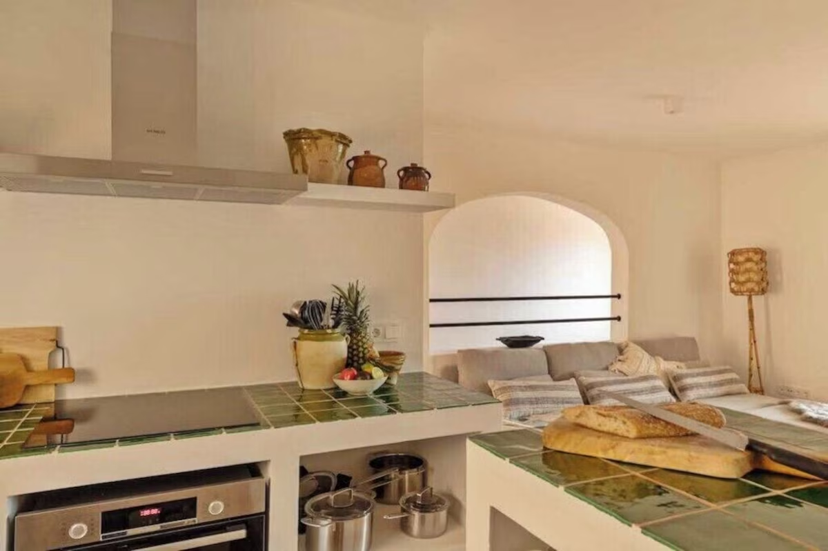 Open kitchen, finished with handmade tiles. The kitchen is well equipped with an oven, dishwasher, induction stove, fridge, freezer, microwave, Nespresso machine, milk frother, kettle.
