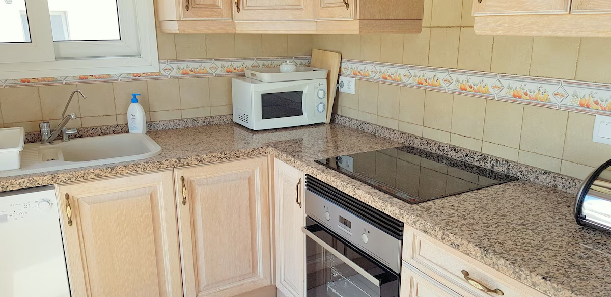 From the Naya you enter into the light and bright lounge area through full sized double glazed patio doors into the open plan living room and dining area with table and chairs for 6 people, also to the well laid out kitchen which is fully equipped with dish washer, a new fridge, oven and hob, and an air fryer, also a water purification system providing fresh filtered drinking water, all with the same stunning views of the Sea and Calpe Rock, and a full wall sized picture window that looks out to the very spacious newly renovated pool and extensive terraces with Pico Bello's Iconic palm tree, and Mediterranean plants, bird of paradise and banana trees. The kitchen also leads directly out to the pool which has two outdoor eating areas, one pool side, and the other in the Plaza, each with table and chairs for 6 people. There is an outdoor kitchen with a full size fridge freezer, Webber charcoal BBQ and electric sockets.